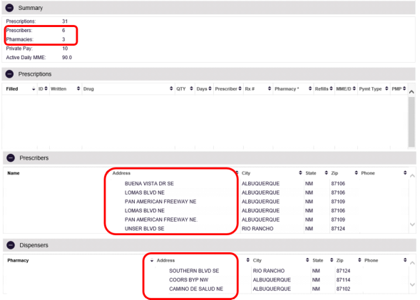 Although a red flag is not a stop sign, it can help you screen for potential increased patient risk associated with controlled substances. Below are how to identify these red flags on a PMP report and related New Mexico statistics. The more “red flags” there are, the higher the risk is for the patient to have an overdose. All statistics are provided by the New Mexico Department of Health.
